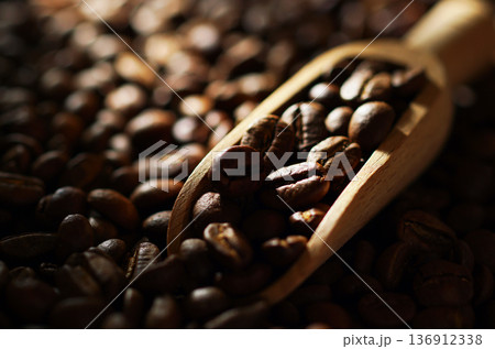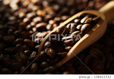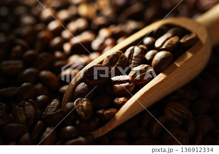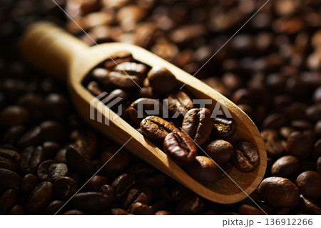 Beautiful wooden spoon displaying glossy coffee beans in detail