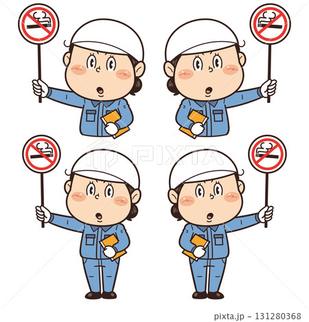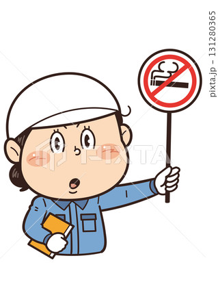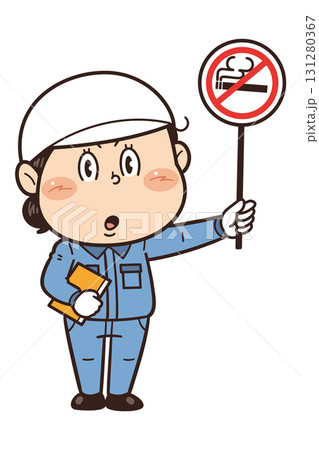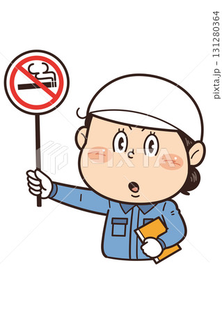 【禁煙】工場や現場で働く女性作業員が禁止標識を持つイラスト|不安全行動・不安全状態・労働災害