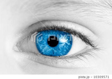 realistic eye with blue iris, black algae and reflection on pupil