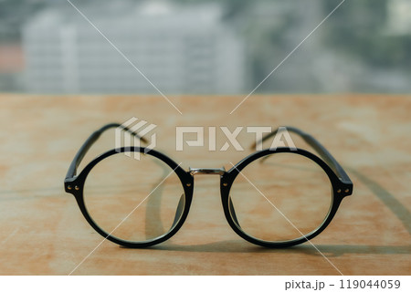 Eyeglasses on wooden desk with city view.