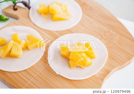 煮リンゴを餃子の皮で包んでいく