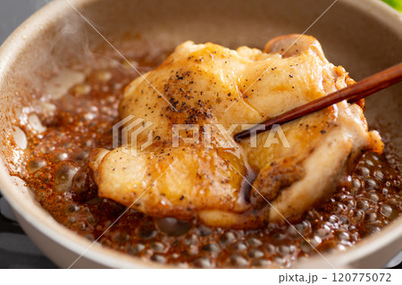 フライパンで鶏もも肉の照り焼きチキンステーキを焼く
