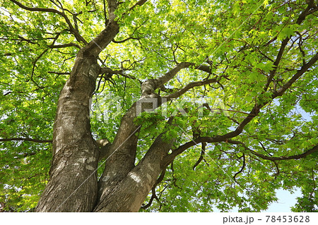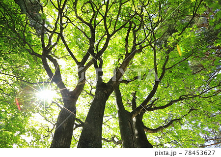 新緑の街に立つビジネスパーソンのグループのあおり構図