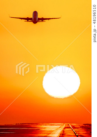 美しい夕陽が燃え上がる様な背景に飛行機風景