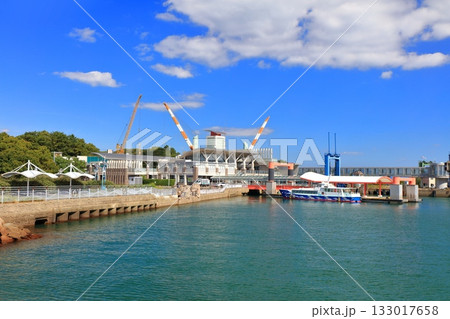 三角港フェリーターミナル(海のピラミッド)「夏空を背景に展望台からパノラマ風景」