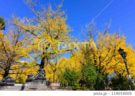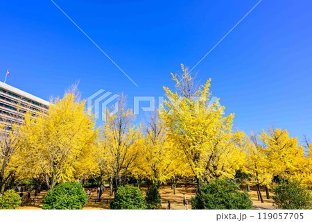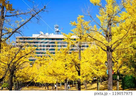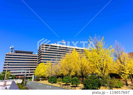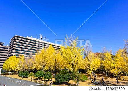 晩秋、黄色く色付いたイチョウが美しい、熊本県庁プロムナードの風景