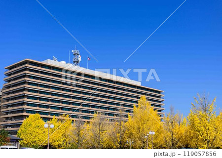 秋晴れに映えるイチョウ観光スポット「熊本県庁プロムナード(イチョウ並木)」熊本市