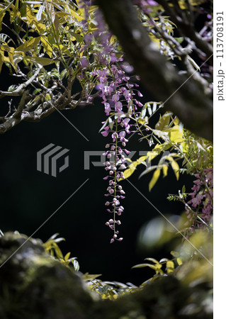 雨の古代の森に咲き乱れる春の花藤の絶景