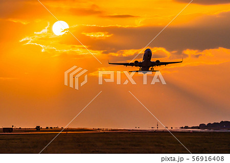 美しい夕陽が燃え上がる様な背景に飛行機風景