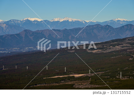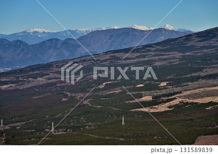 愛鷹連峰の越前岳の平坦地から 富士の裾野の向こうに聳える雪化粧した南アルプス