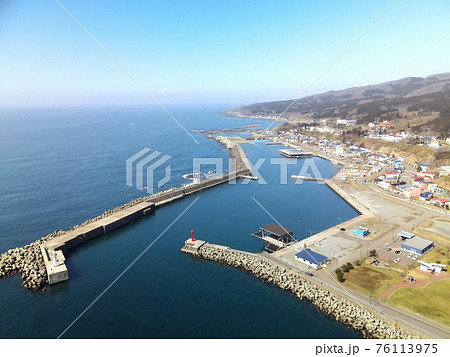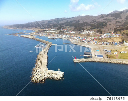 早春の北海道八雲町熊石地区熊石漁港の風景を空撮