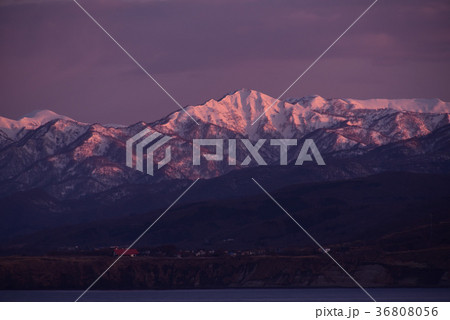 北海道八雲町熊石地区の冬の冷水岳に朝日が差して赤く染まる風景を撮影