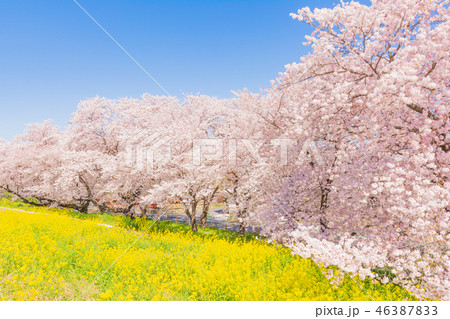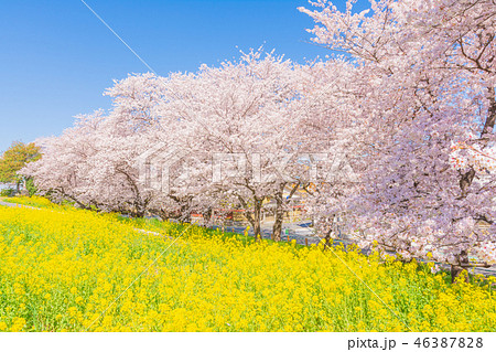 日本の春 熊谷桜堤の桜並木と菜の花