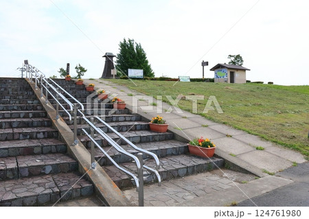 土手の上の園地にある地図とそこから見る赤城山