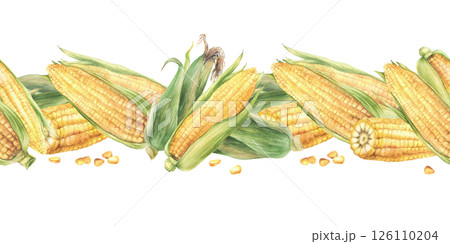 Sweet Corn seamless border. Watercolor realistic vegetables food pattern. Yellow cut and whole maize cob, kernel of corn, husks. Hand drawn illustration for food labelling Isolated from background