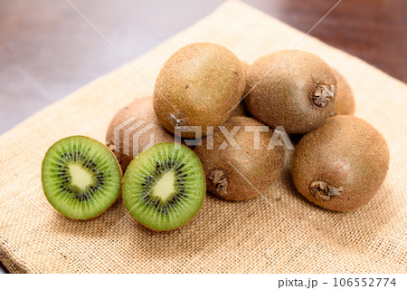 麻袋の上の山盛りキウイフルーツと輪切りで断面の見えるキウイ