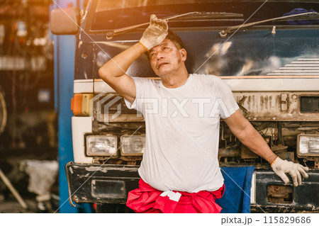 Tired Exhausted head ache health problem working hard work in garage auto service.