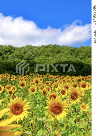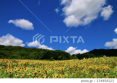 喜多方市三ノ倉高原の青空にひまわり畑