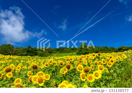 福島県喜多方市熱塩加納町相田字北権現森甲 三ノ倉高原花畑の斜面一面のヒマワリ畑と快晴の青空