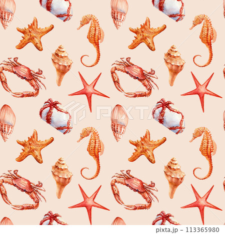 Watercolor sea summer seamless pattern. Underwater creatures, crab, starfish, sea shell, coral, Marine background design