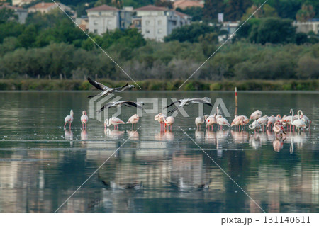 Flamingoes at dawn pastel colors in middle of water pond Biguglia in Corsica near Bastia Tall grasses on the background