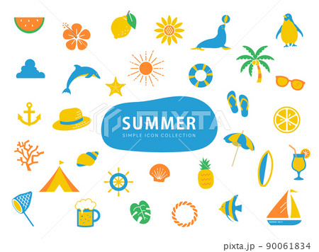 夏のシンプルなイラストアイコンセット / ノーマル / ビーチ、海、自然、動物、花、フルーツ