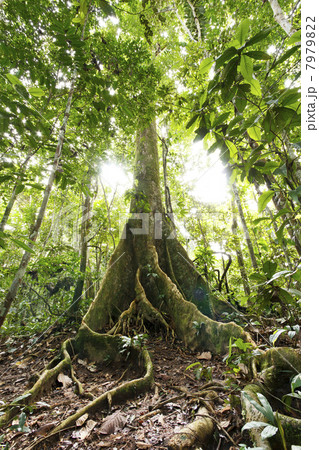 Low angle view of a large tree in primary tropical rainforest with buttress roots, Ecuador