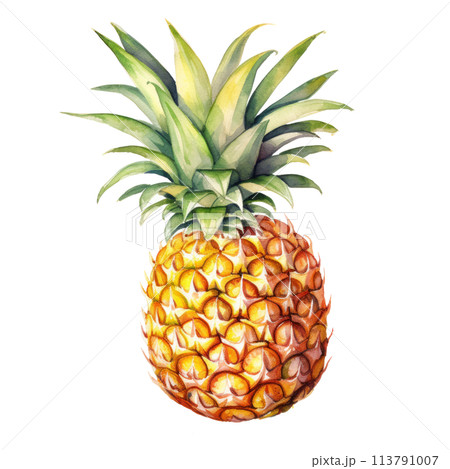 Realistic watercolor of a pineapple with vibrant green leaves.