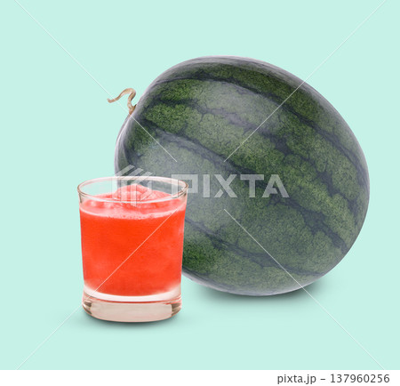 Fresh watermelon and watermelon smoothie, healthy summer drink concept on green background.