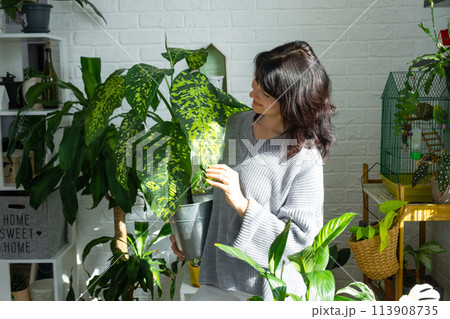Repotting and caring home plant dieffenbachia Cheetah into new pot in home interior. Woman breeds and grows plants as a hobby, holds Varietal diffenbachia with large spotted leaves, large size