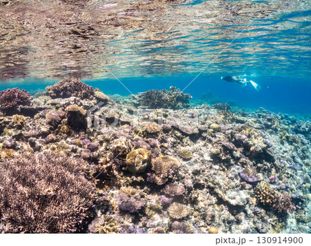 サンゴに隠れる大きなワモンダコ。美しいサンゴ礁と熱帯魚の群れ。 沖縄県島尻郡慶良間諸島座間味島安室島