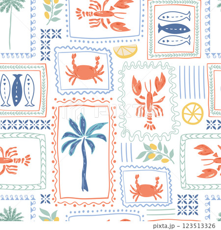 Tropical lobster pattern, summer Italy vacation mood. Retro palm trees, sardines print. Cute vector Mediterranean wallpaper