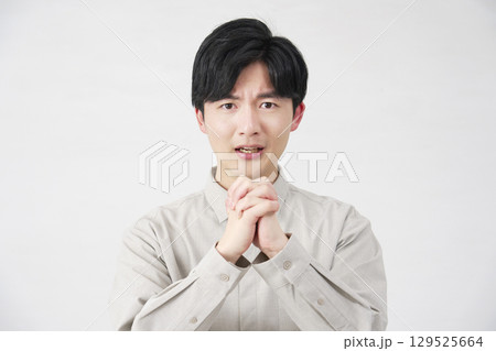 女性 事務員 懇願する 合掌 白背景 カメラ目線