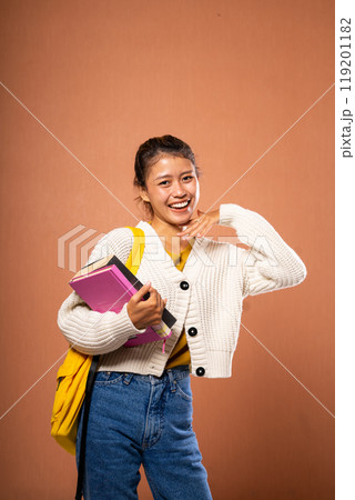 Cheerful Student Posing with Books and Backpack Against a Warm Background