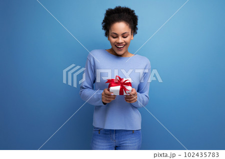 handsome american man with afro curls in casual denim outfit on blue background with copy space