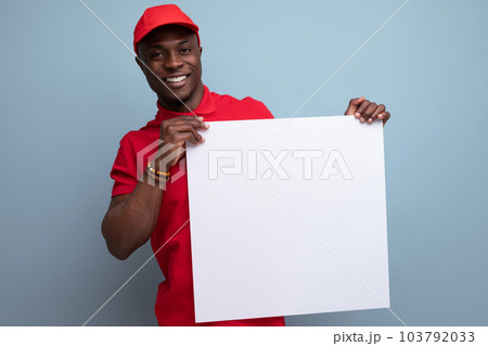 young delivery worker american man in red t-shirt and baseball cap holding paper mockup