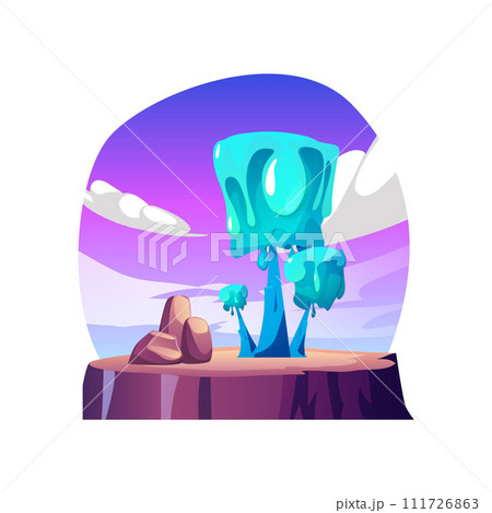 Magic blue tree on rock land from alien world, cartoon vector fantasy game plant with strange crown with dripping slime