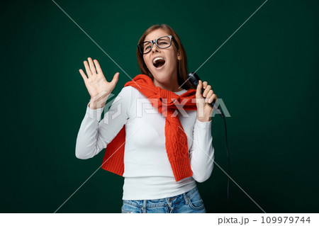 energetic pretty cute brunette young woman in shirt listening to music on studio background with
