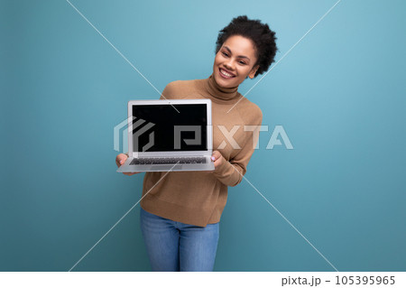 young happy latin business woman with curly hair holding laptop with mockup and isolated studio