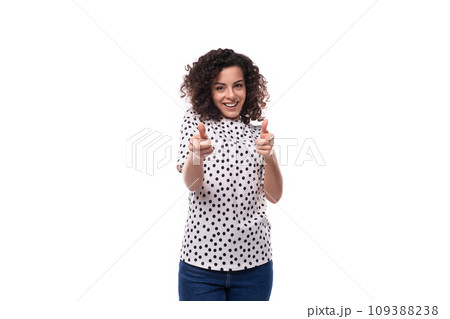 positive confident young brunette dressed in a blouse on a white background with copy space