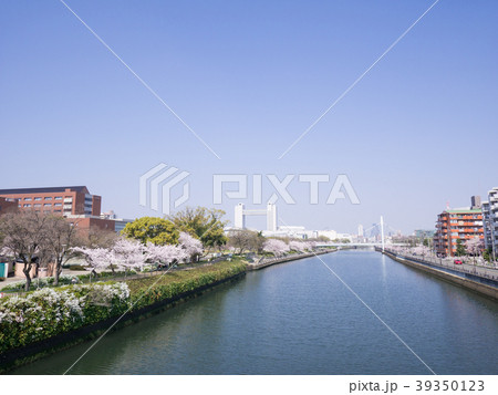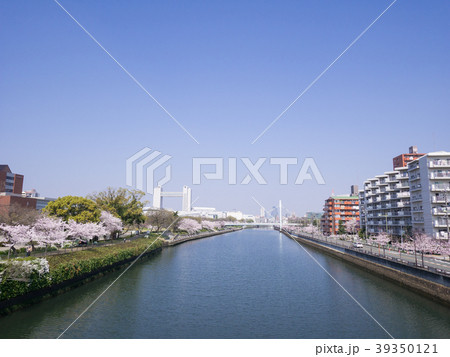 名古屋熱田区都市風景 熱田記念橋から名古屋国際会議場と桜並木を臨む