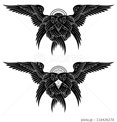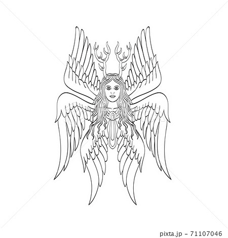 Seraph or Seraphim a Six-Winged Fiery Angel with Six Wings and Deer Antlers Tattoo Style Black and White