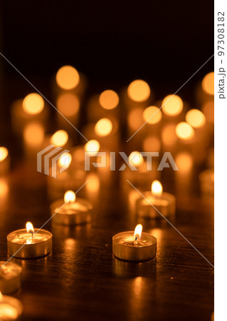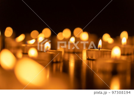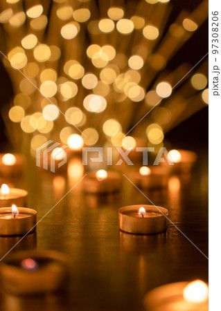 Red Candle with fire against defocused lights in darkness with golden bokeh in the dark Background