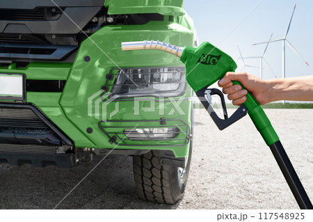 Hand with biofuel filling nozzle on a background of green truck