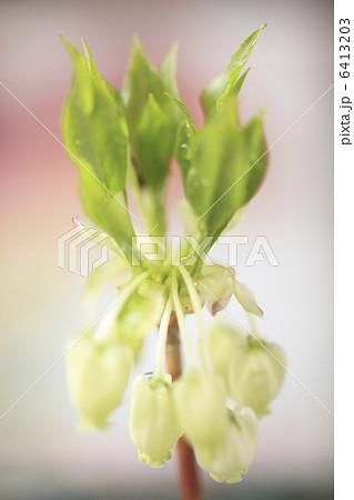 春の日ざしを浴びたドウダンツツジ(白い花と葉をつけた灯台躑躅の枝のクローズアップ)