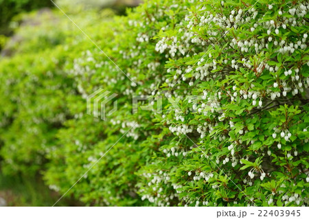 春の日ざしを浴びたドウダンツツジ(白い花をつけた公園の灯台躑躅)