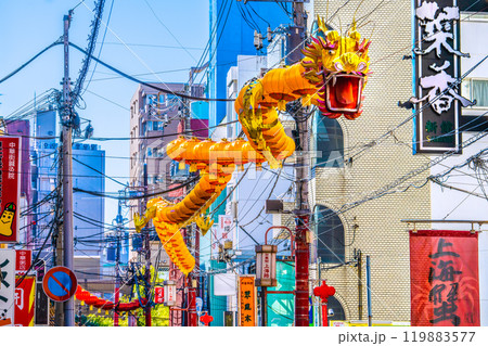 日本の横浜都市景観 2025春節燈花・中華街上海路にお目見えした龍のランタン=11月3日