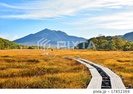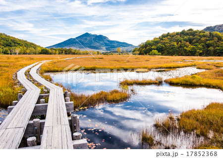 尾瀬ヶ原の紅葉 木道と燧ケ岳