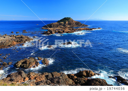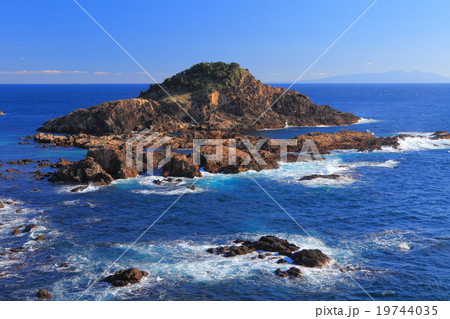 伊豆半島・南伊豆・爪木崎・爪木崎灯台から眺める爪木島と青い海、周囲の岩礁・静岡県下田市(2)