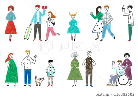 色鉛筆で描いたいろんな人物の上半身イラストセット